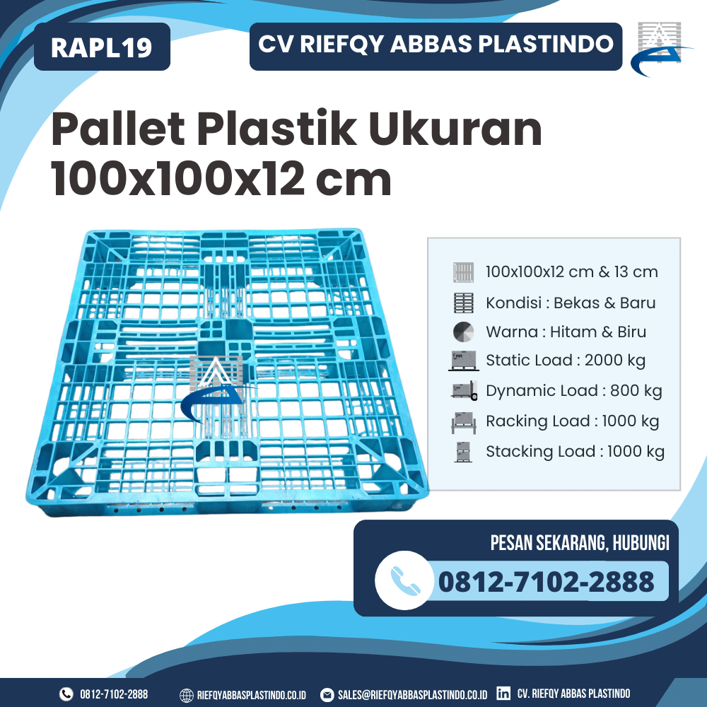 CV Riefqy Abbas Plastindo dengan bangga menghadirkan Pallet Plastik Ukuran 100x100x12 cm – RAPL19, sebuah solusi praktis untuk kebutuhan penyimpanan dan penataan barang dengan kualitas tinggi serta harga yang tetap terjangkau. Pallet ini dirancang menggunakan material premium yang kokoh dan tahan lama, menjadikannya pilihan tepat bagi Anda yang mengutamakan keamanan, kekuatan, dan efisiensi dalam setiap penggunaan.