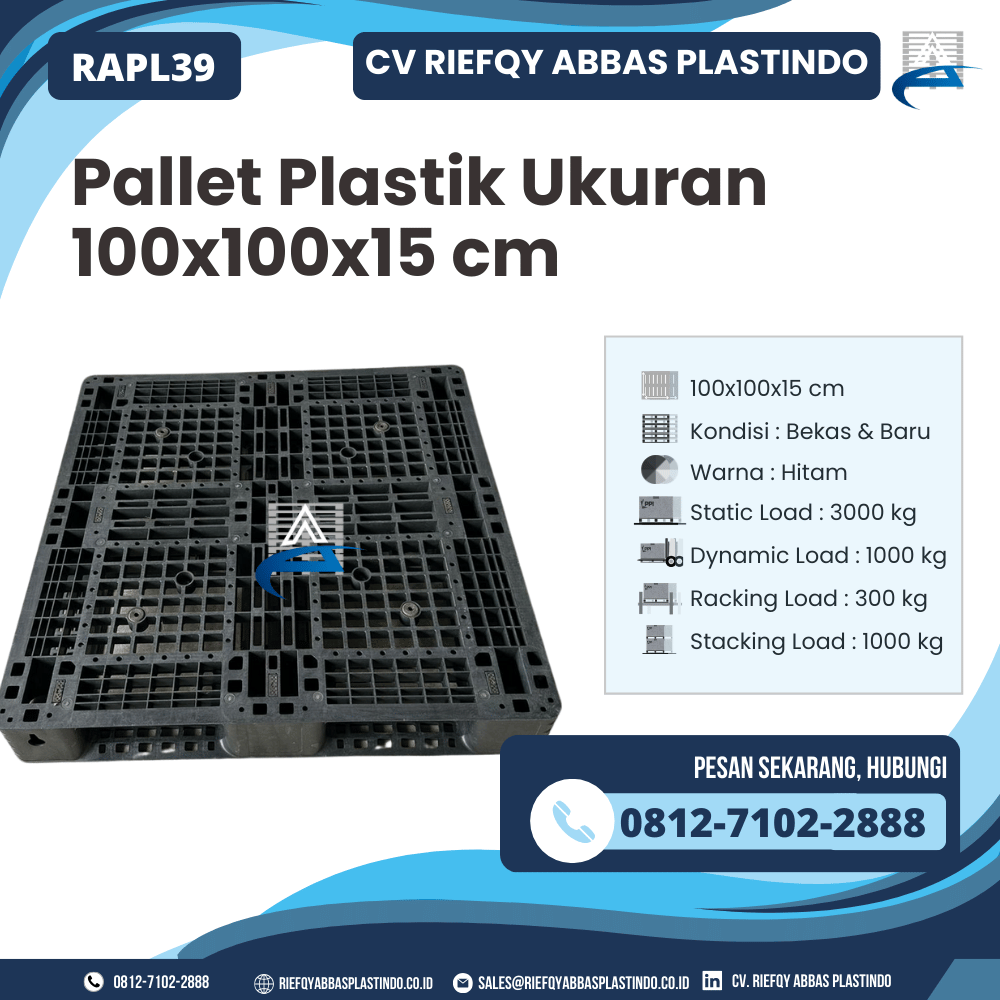 Pallet Plastik Ukuran 100x100x15 cm – RAPL39 dari CV Riefqy Abbas Plastindo merupakan pilihan tepat untuk penyimpanan yang praktis, aman, dan efisien. Dengan kualitas premium, model jaring yang kokoh, serta fitur anti slip dan double stacking, pallet ini memberikan performa terbaik.