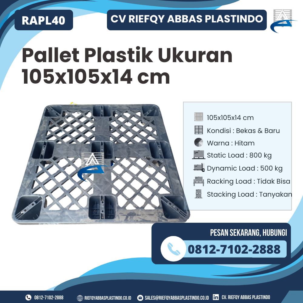 Pallet Plastik Ukuran 105x105x14 cm – RAPL40 dari CV Riefqy Abbas Plastindo merupakan pilihan tepat untuk penyimpanan yang praktis, aman, dan efisien. Dengan kekuatan tinggi, desain jaring yang stabil, fitur anti slip, dan kemampuan double stacking, pallet ini menawarkan performa unggul untuk berbagai kebutuhan penyimpanan.