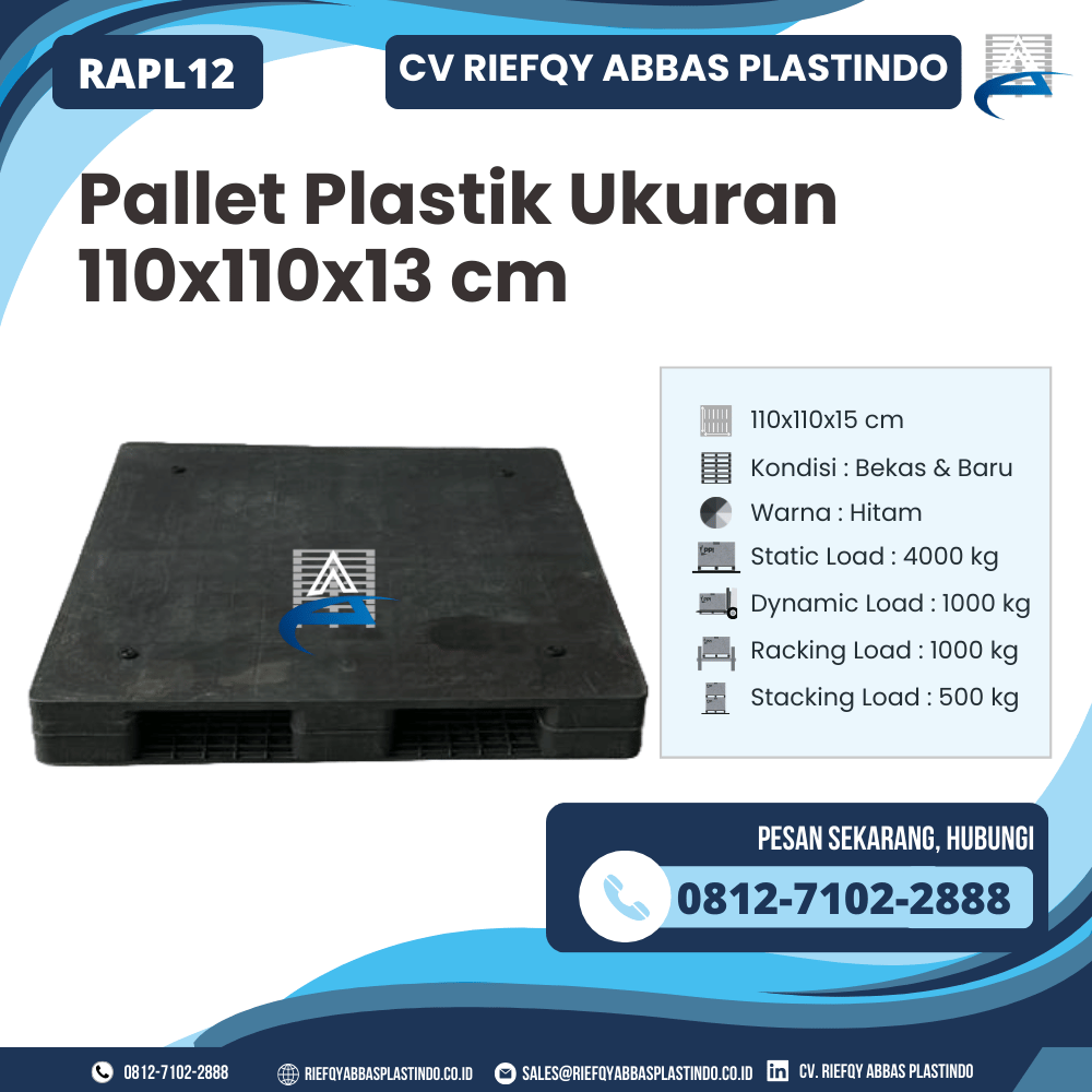 CV Riefqy Abbas Plastindo mempersembahkan Pallet Plastik Ukuran 110x110x15 cm – RAPL12, sebuah produk berkualitas yang dirancang untuk memberikan daya tahan, kemudahan, dan kepraktisan dalam penataan maupun penyimpanan barang. Pallet ini hadir dengan material premium, desain kokoh, serta spesifikasi unggul yang memastikan pemakaian jangka panjang tetap stabil dan efisien.