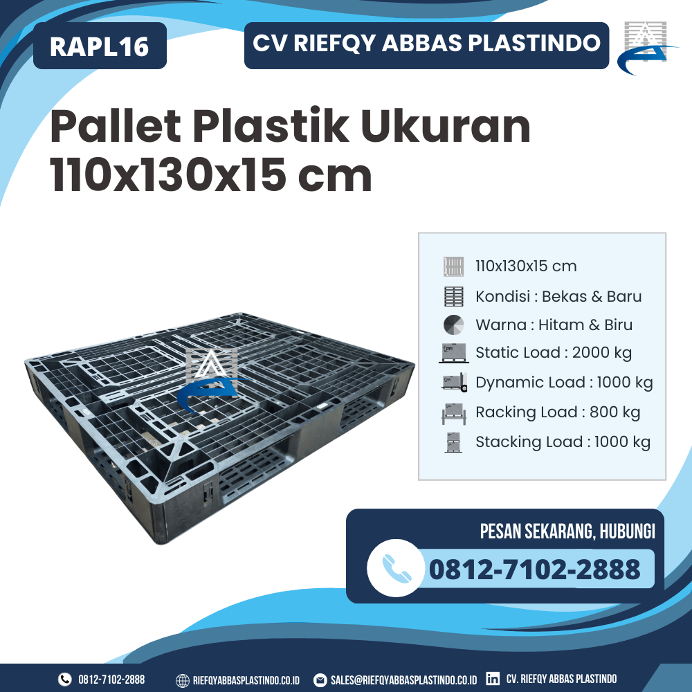 Dengan dimensi 110x130x15 cm, pallet ini memiliki area cukup luas untuk menampung berbagai jenis barang. Ukuran tersebut dikombinasikan dengan bobot yang ringan menjadikan RAPL16 praktis digunakan tanpa mengurangi kekuatannya.