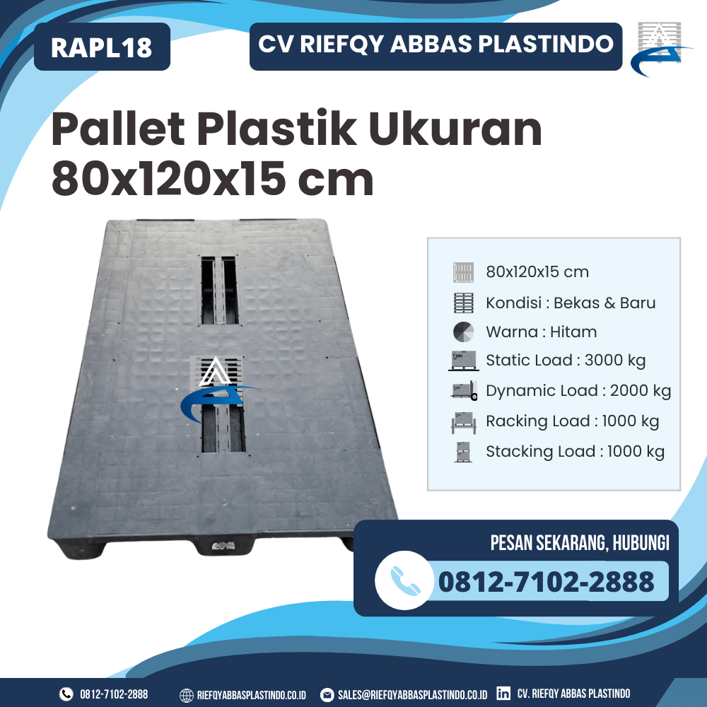 Pallet Plastik Ukuran 80x120x15 cm – RAPL18 merupakan pilihan terbaik bagi Anda yang menginginkan pallet dengan daya tahan kuat, desain modern, dan harga yang ekonomis. Dibuat dari material HDPE/PP berkualitas, pallet ini memiliki kapasitas beban tinggi serta mendukung berbagai kebutuhan penyimpanan maupun penataan.